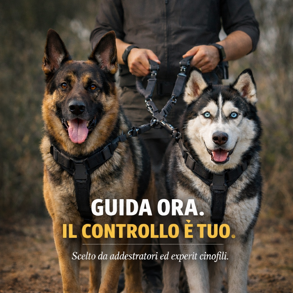 Viene distribuita, stabilizzata e riportata al centro.I due cani restano separati, allineati e gestibili anche nei momenti di distrazione.Puoi fermarti, cambiare direzione o rallentare senza perdere il controllo.Non serve stringere più forte.
